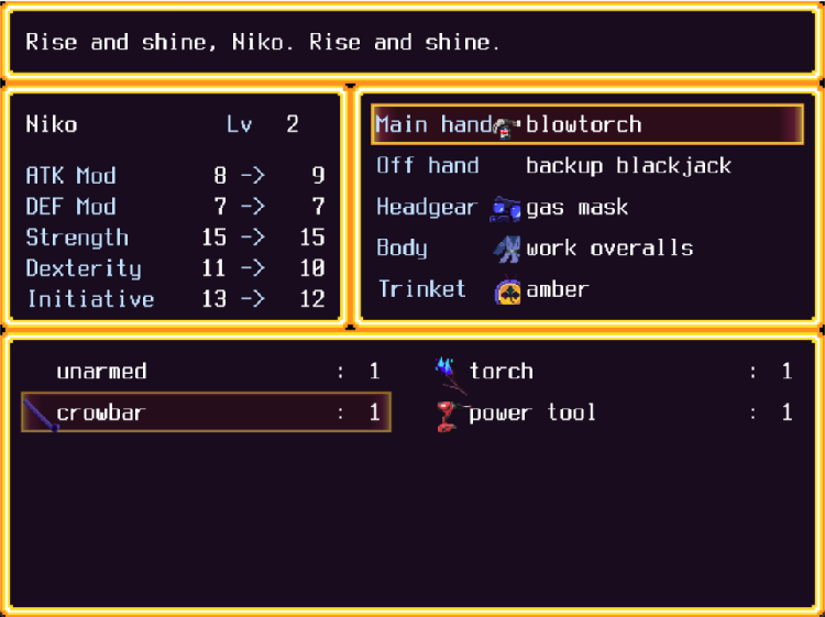 DISCLAIMER: This was supposed to be a side project where I shoehorn combat into OneShot, but it got blown out of proportions. The music and scripts I use DO NOT belong to me, acknowledged in the CREDITS.txt file below. OneShot belongs to Future Cat Games.